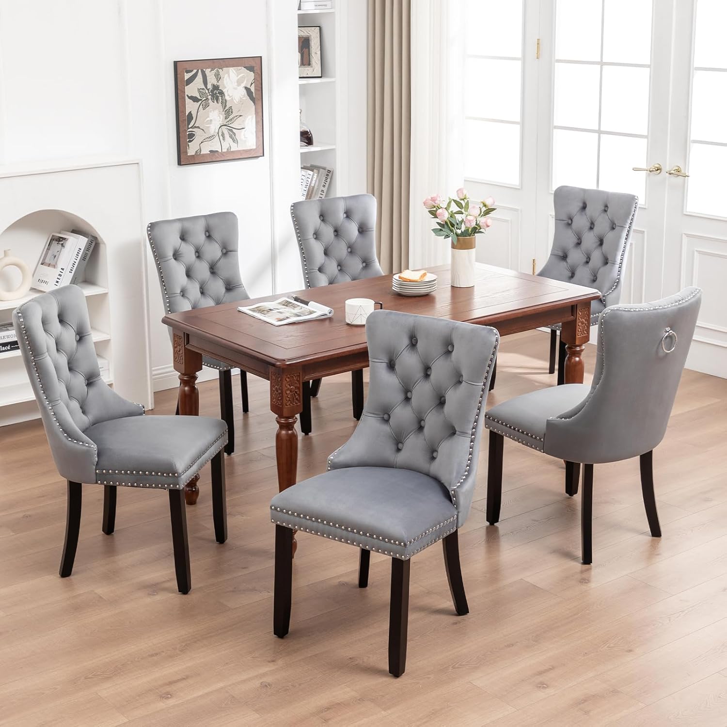 Velvet Dining Chairs Set of 6,Upholstered Dining Chairs with Ring Pull Trim and Button Back,Modern Seating for Kitchen, Bedroom & Living Room(Grey)