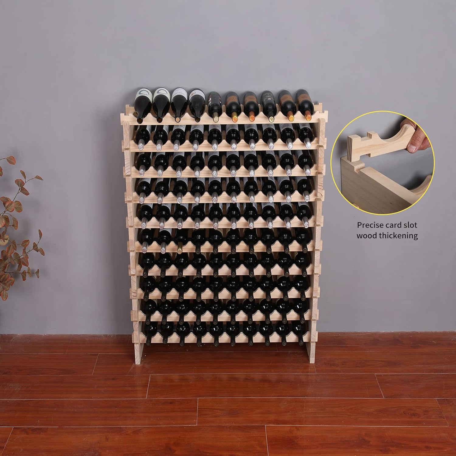 【Made of pine wood】 High-quality, smooth solid wood. We thickened the wood and widened the size. 【Easy to install】 can be easily assembled together without nails or screws. 【Assembled size】 41"X 12" X 46"Store 100 bottles of 750ml wine 【Factory direct sales】 Quality assurance, Warranty for 10 years
